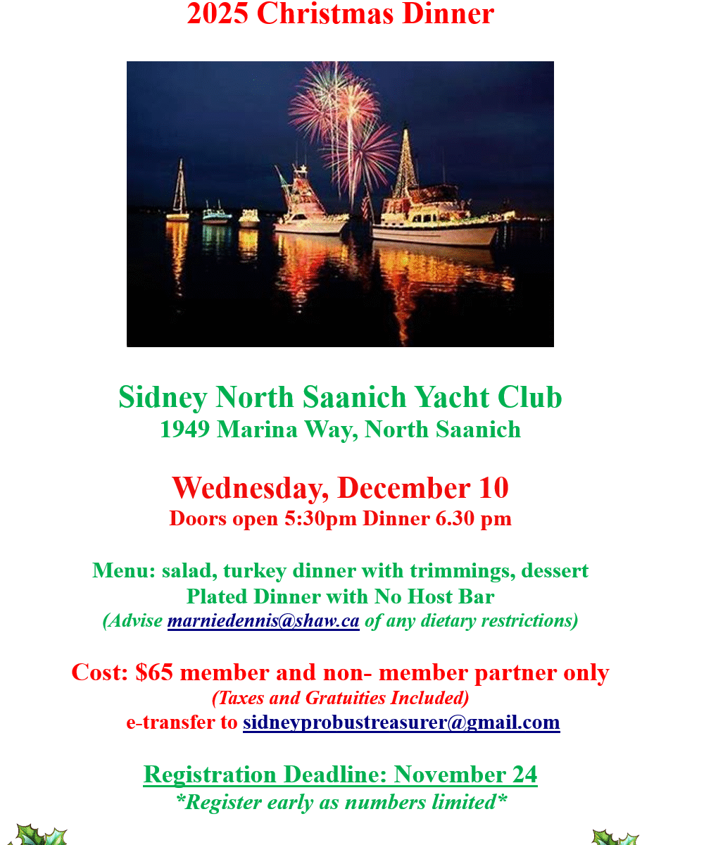 The Probus Club of Sidney hosts several events during the year for members and guests. Events that have been hosted in prior years include Christmas Dinners, Summer Barbecues, excursions to attend the Chemainus Theatre Festival, and tours of many local businesses and organizations that members have expressed interest in learning more about. Frequently these events follow the organization or business having been featured in our monthly speaker series. Input from members is encouraged to assist in the selection of events that will be of interest to the broader membership.